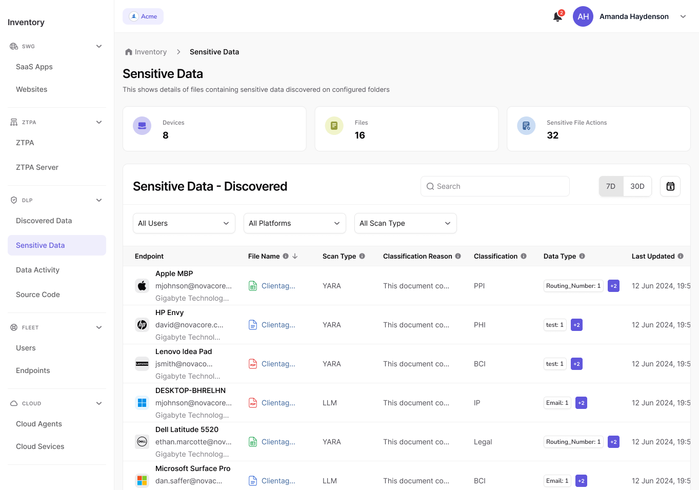 Discover sensitive data on endpoints and prevent exfiltration across network & browsers. Supports sensitive data scanning and compliance enforcement!