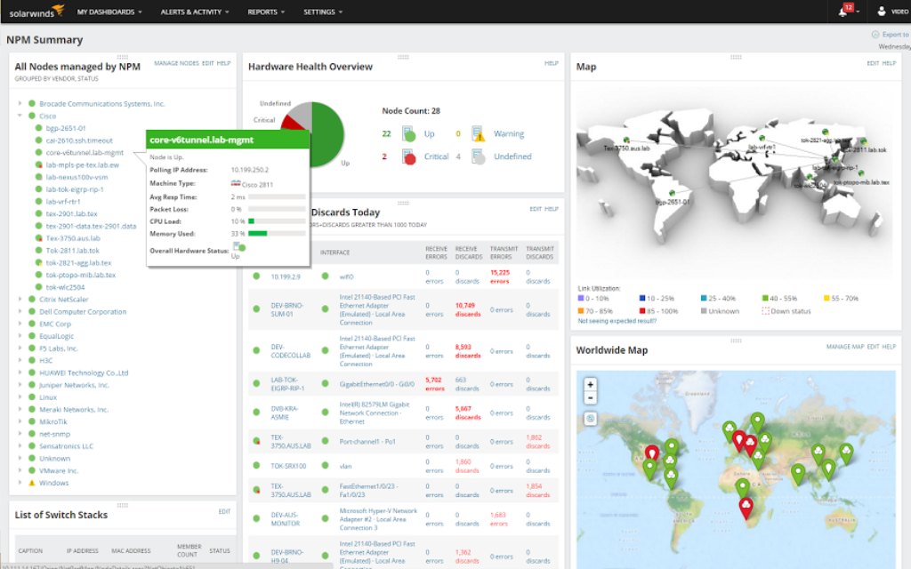 Its Orion platform consolidates multiple monitoring components into a single dashboard and offers advanced event correlation capabilities that allow IT teams to link performance events, understand root causes faster, and optimize incident response. SolarWinds also covers cloud visibility, database performance analysis, and application performance monitoring.