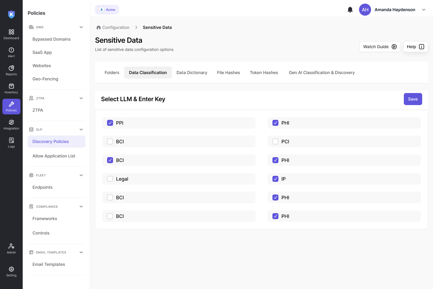- Policy Enforcement: Enforcing customizable rules to allow or block certain actions, such as data sharing or uploading.