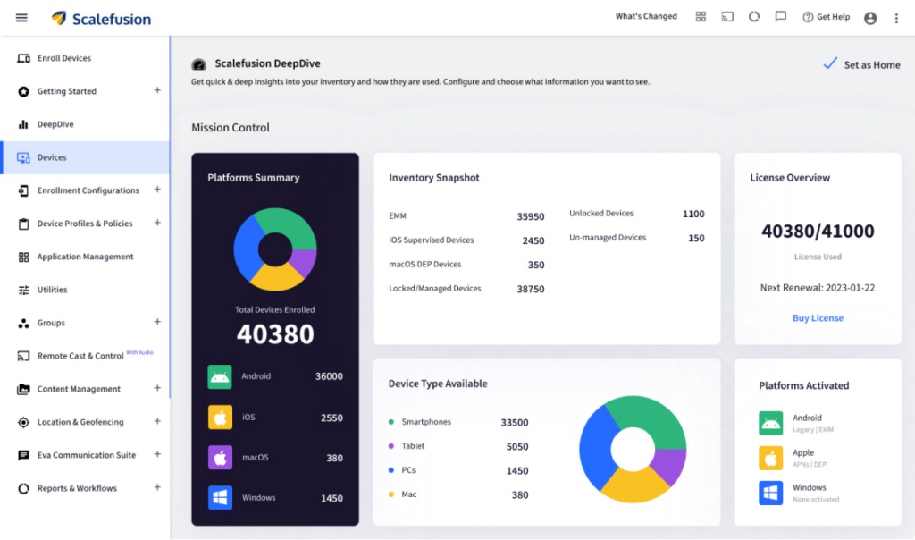 - Policy Management: Enforces encryption, password rules, and OS updates across fleets with role-based access.